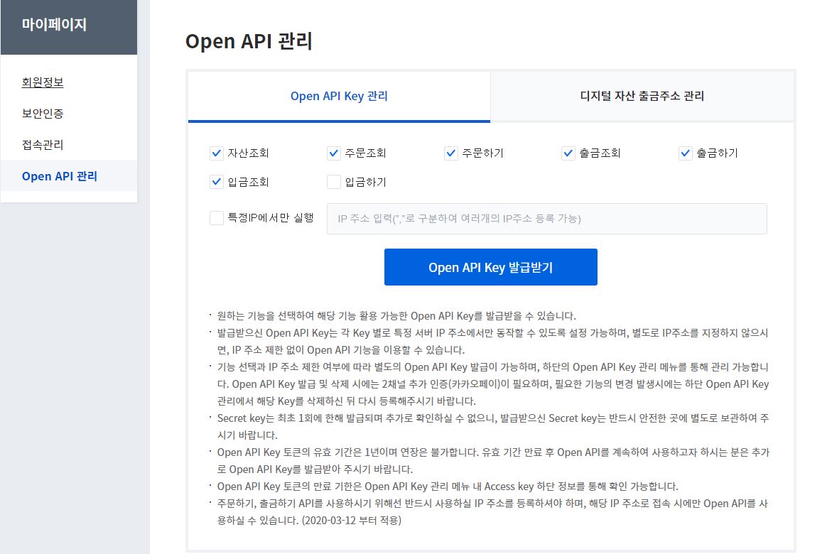 업비트에서 액세스 키와 시크릿키를 신청해서 받아야 합니다.