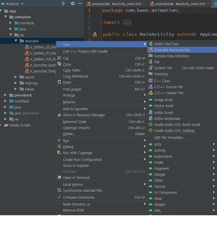res -> drawable 선택 -> 마우스 오른쪽 -> Drawable Resource File