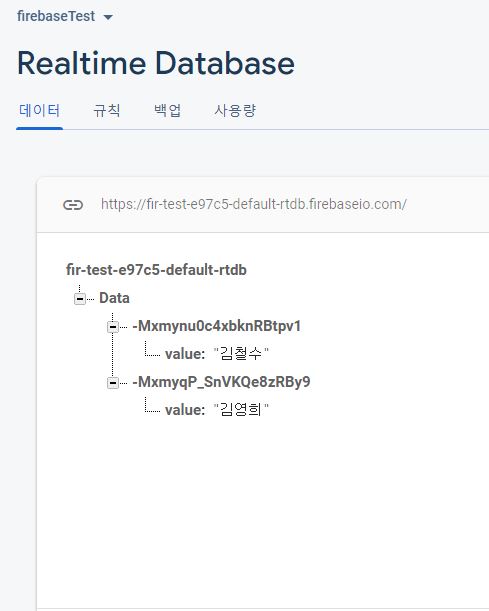 databaseReference에 키값, 이름값, 데이터 값을 입력하면 저장된다.