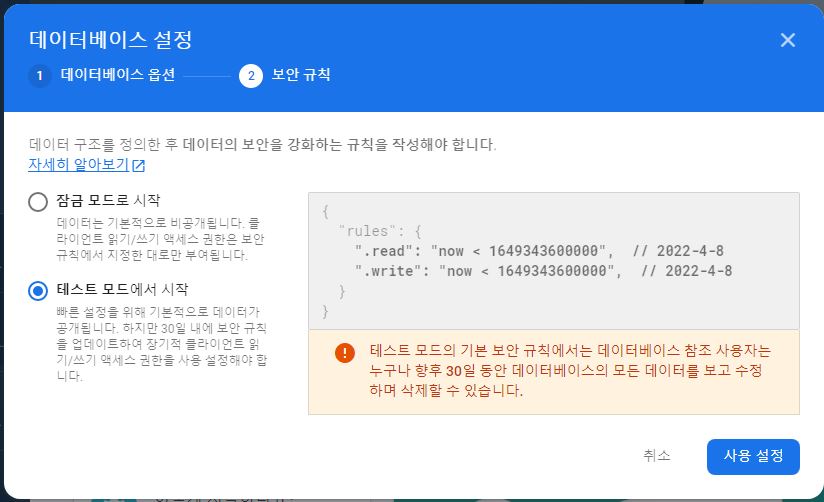 - tools -> firebase -> 위에서 3번째(Realtime Database) 선택